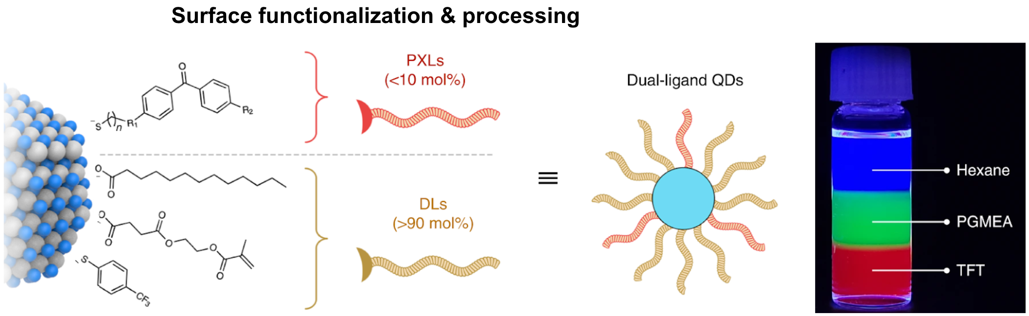 We modify the surface of quantum dots through ligand exchange and functionalization. This control improves solubility in different solvents, ensures better stability, and provides chemical flexibility for further processing.