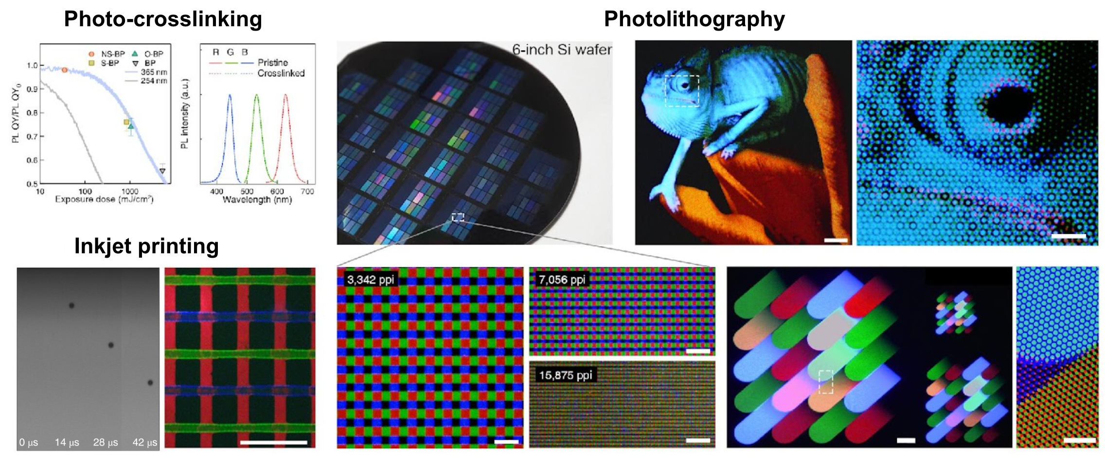Quantum dots with tailored surface chemistry can be processed into thin films and nanostructures using various fabrication techniques. Solution-based methods such photolithography and inkjet printing enable integration into device architectures for photonic and optoelectronic applications.